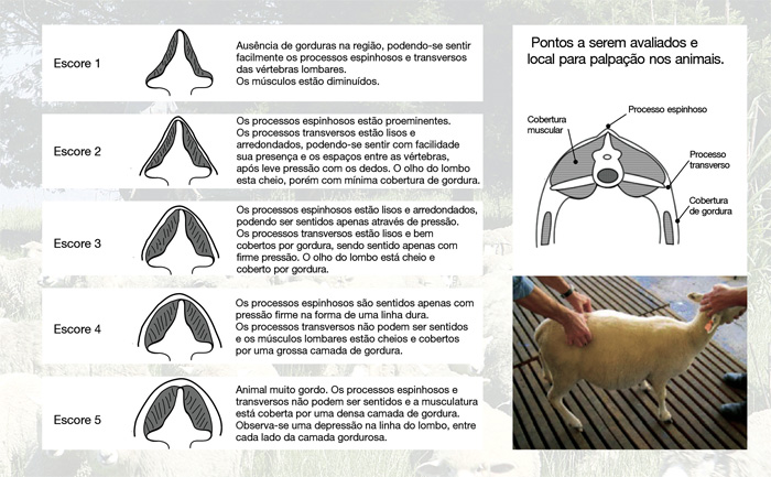 O escore corporal é uma maneira de analisar se seu animal está abaixo ou acima do peso, entre a última costela e os ossos do quadril de cada ovino, passe a mão sobre a região da coluna e do lombo. Os "processos transversos", que são as saliências ósseas de cada lado de cada vértebra, e os "processos espinhosos", que são a parte da coluna que aponta para cima, estão cobertos por gordura. A condição corporal é menor quando o osso é mais visível. Lembre-se de que a lanosidade do osso é determinada pelo músculo ou gordura, não pela densidade da lã.